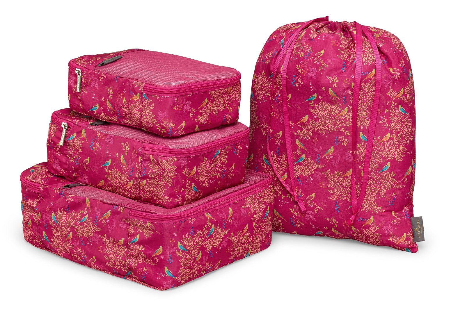 Stay organized and stylish on your next adventure with the Sara Miller London packing cube set in the elegant Pink Chelsea print. This four piece set of fabric storage bags have been designed to fit perfectly inside your luggage.