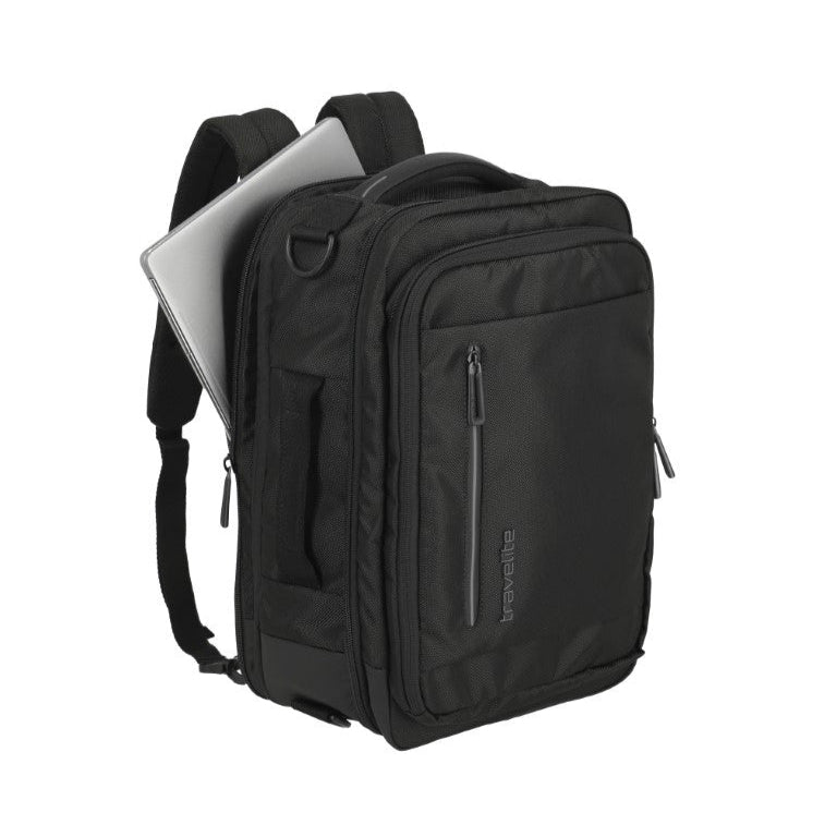 Crosslite is a durable soft sided luggage and travel bag collection by Travelite. It is made from durable, tightly woven recycled polyester. The Boarding Backpack has a spacious main compartment that benefits from various compartments to keep your belongings organised. This is a 2 in 1 bag and easily converts into a business shoulder bag. There is a separate laptop compartment and top and side carry handles.
